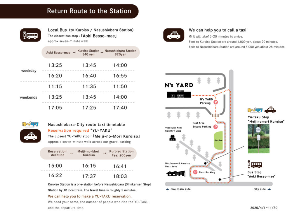 | Upon Request | Taxi | Nasushiobara Station* | N’s YARD | 20–30 minutes |