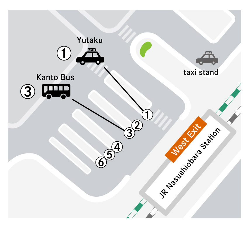 - • Wait at the Yutaku stop at the west exit of Nasushiobara or Kuroiso Station.