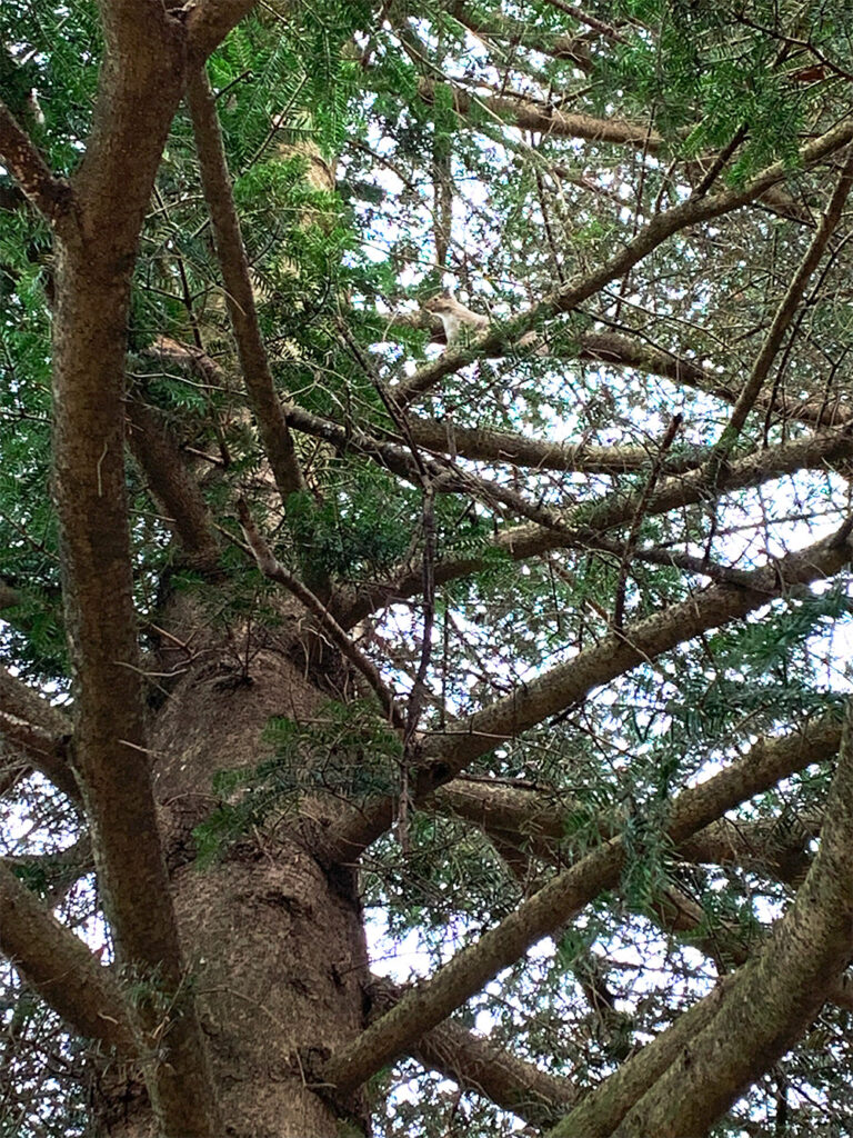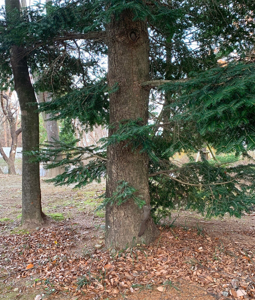 Left of the photo: A squirrel at the base of the fir tree.