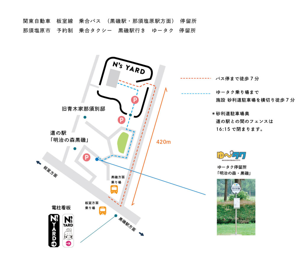 ご自身のN’s YARD滞在予定時間や、道の駅「明治の森・黒磯」のご利用有無などをご考慮の上、お帰りの時間と手段をご検討ください。
